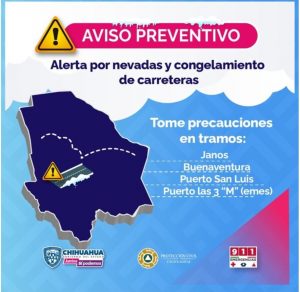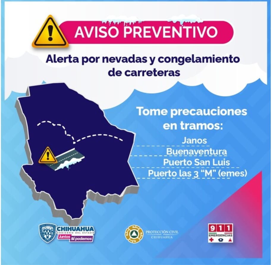 La CEPC exhortó a los automovilistas que transitan por tramos carreteros de Janos y Buenaventura, como Puerto San Luis y Puerto las 3 “M” (emes), que extremen precauciones por la posibilidad de presencia de nieve.