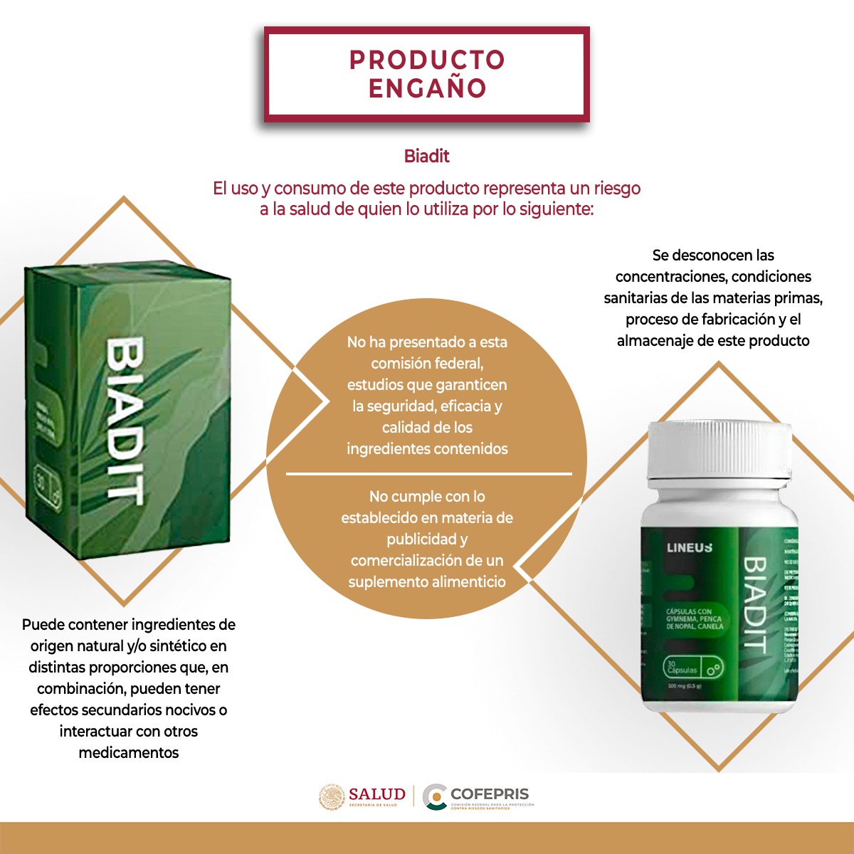 Además, los productos engaño como Biadit suelen contener ingredientes de origen natural o sintético en distintas proporciones que, combinados, pueden tener efectos secundarios nocivos o interactuar de forma negativa con medicamentos que se estén consumiendo.
