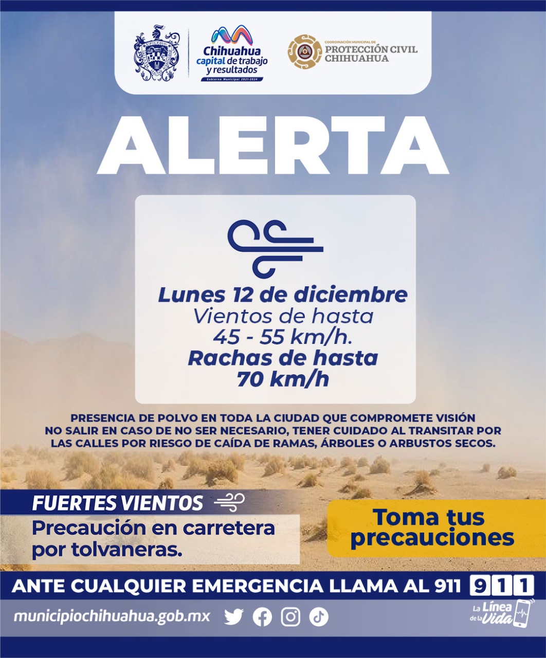 La Coordinación Municipal de Protección Civil, informa que para este lunes 12 de diciembre, se esperan fuertes vientos, debido a la entrada de un nuevo frente frío.