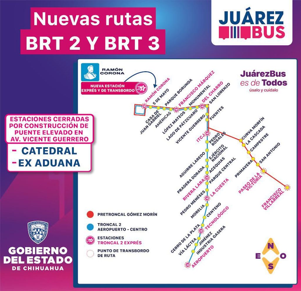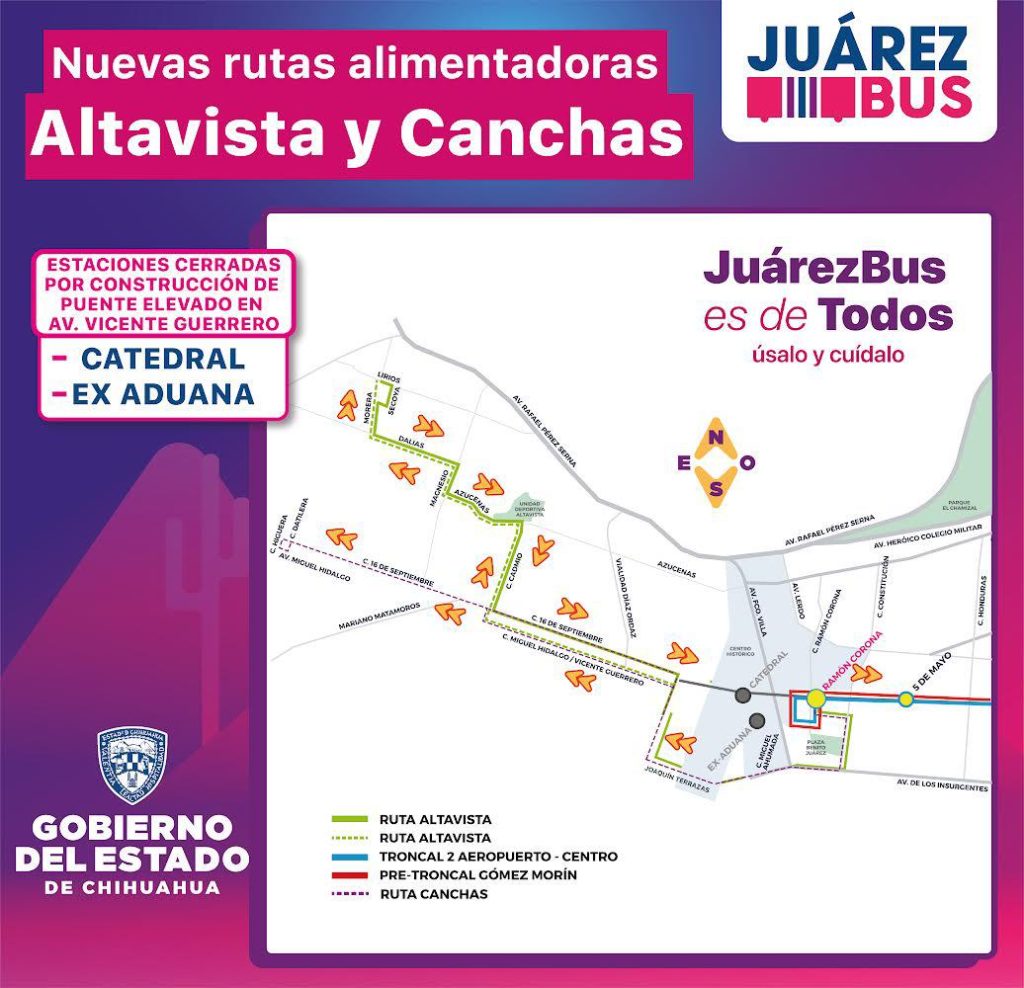 La Secretaría General de Gobierno, a través de la Operadora de Transporte (OTV), informa que a partir del domingo 13 de octubre se implementará una nueva ruta temporal del JuárezBus, debido a la construcción del puente elevado sobre la avenida Vicente Guerrero.