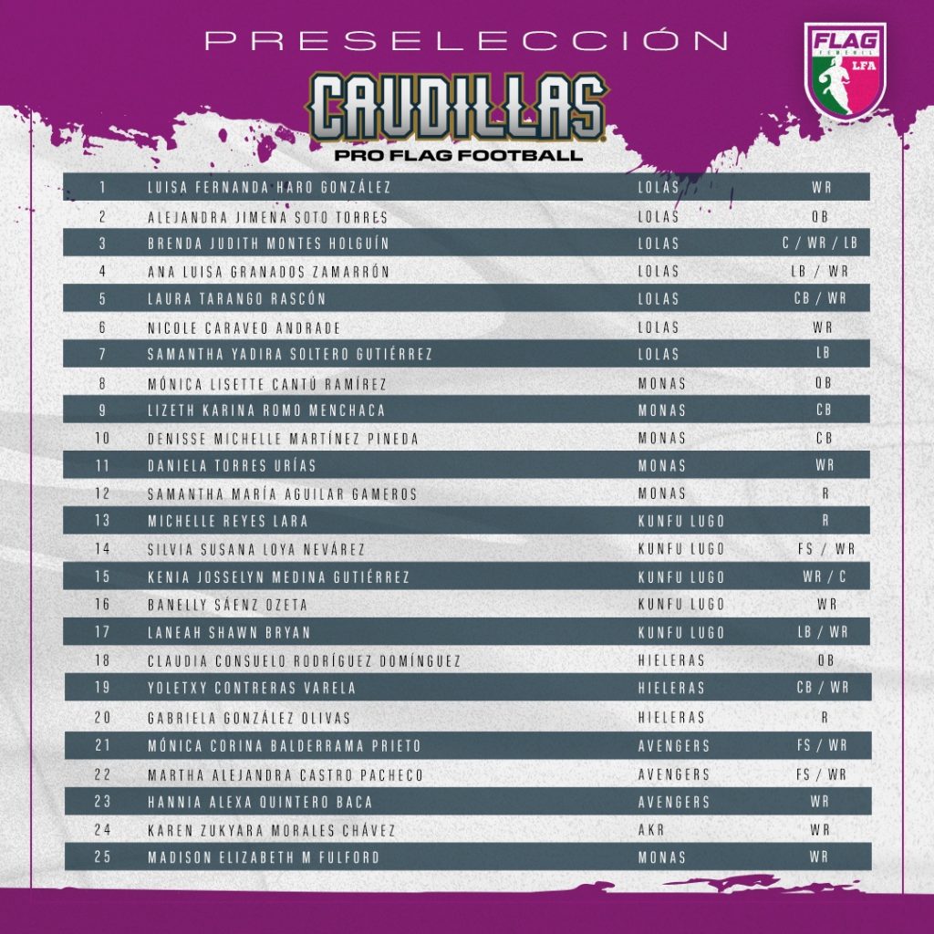 Las autoridades de la franquicia de los Caudillos de Chihuahua y ahora de Caudillas Pro Flag Football, dieron a conocer la primera lista de jugadoras que tendrán la oportunidad de formar parte del equipo chihuahuense y de esta manera, participar en la competencia de futbol bandera de la Liga de Football Americano Profesional (LFA).