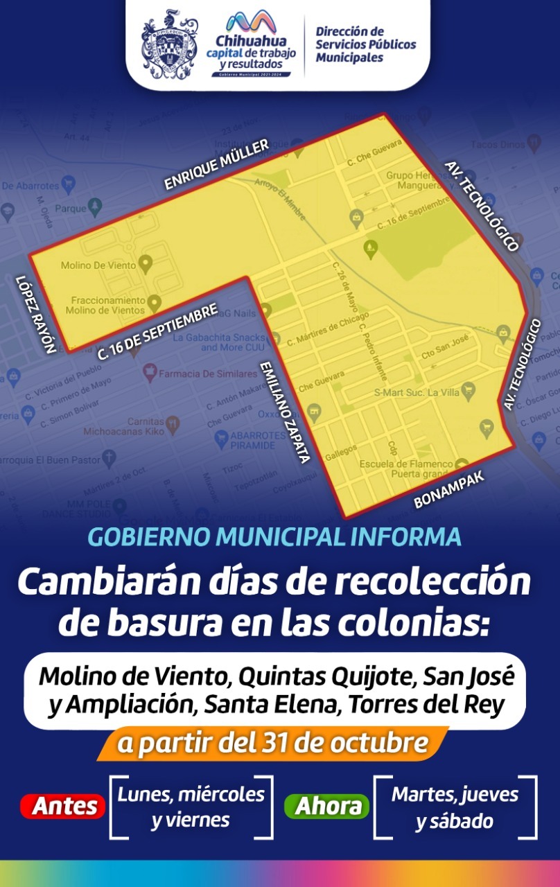 Las colonias que cambiarán sus días de recolección son: Molino de Vientos, Quintas Quijote, San José y Ampliación, Santa Elena y Torres del Rey, en las mencionadas colonias se recogían los desperdicios los días lunes, miércoles y viernes, sin embargo, a partir del 31 de octubre el retiro de residuos serán los días martes, jueves y sábado.
