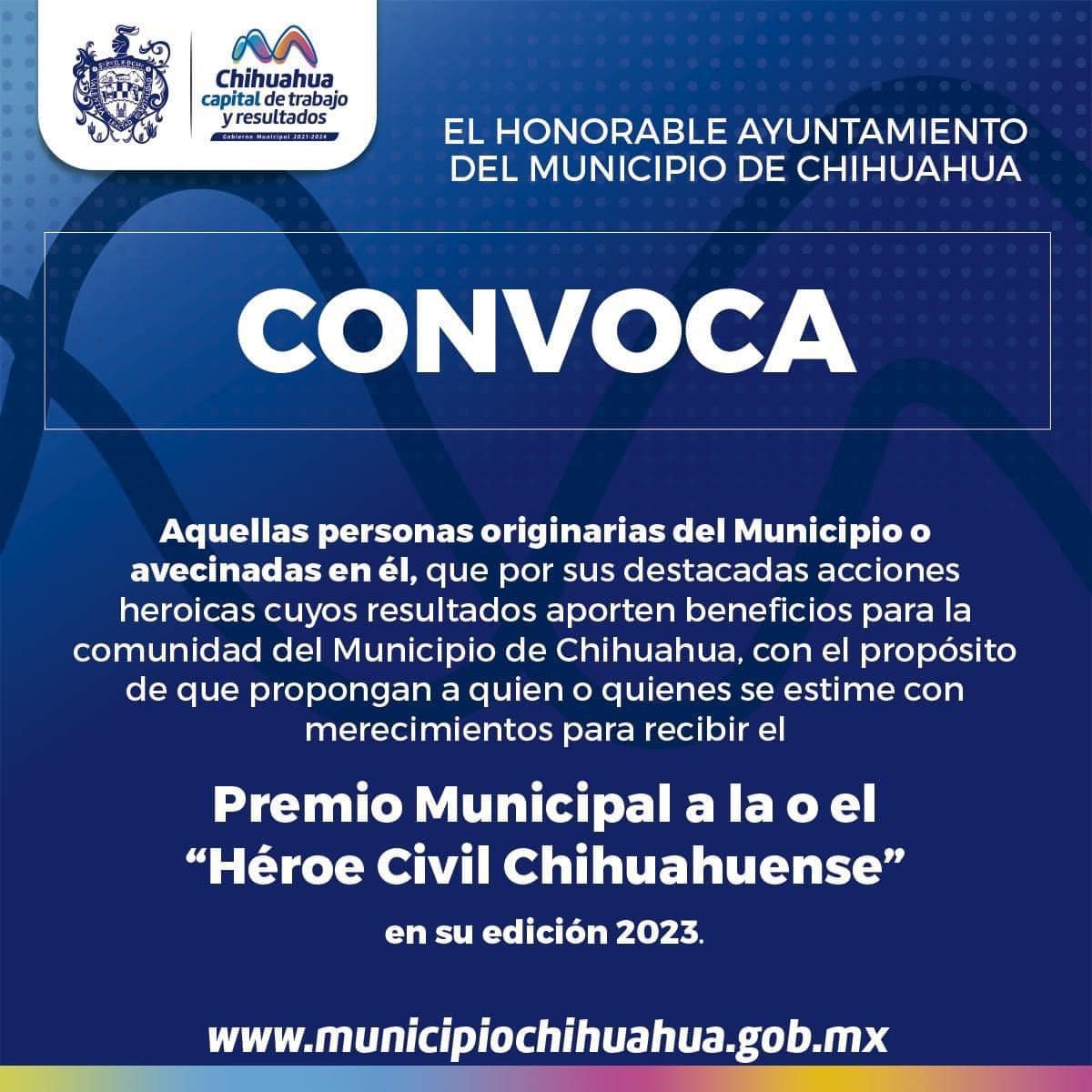 El Gobierno Municipal lanzó la convocatoria Héroe Civil Chihuahuense, el cual recibirá una placa conmemorativa y un premio de hasta 20 mil pesos (200 veces el valor diario de la Unidad de Medida y Actualización -UMA- que actualmente se cotiza en 103.74 pesos, según el Inegi).
