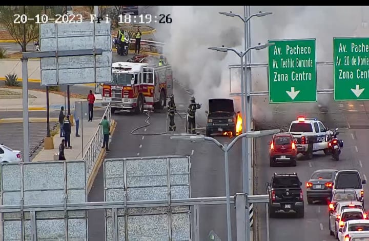Fue en la avenida Pacheco y Juan Pablo ll donde una camioneta Ford de modelo atrasado sufrió una falla mecánica generando fuego en el área del motor por lo que tras percatarse las cámaras PECUU lograron activar de inmediato el 911.