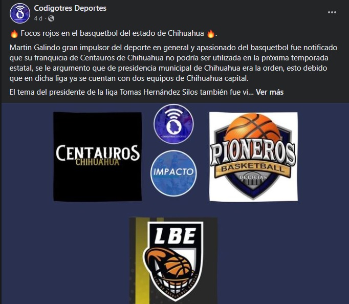De acuerdo con información de la página «Código deportes», están fuera de la próxima temporada de básquet estatal, los equipos Centauros (de ésta capital) y Pioneros (de Delicias). Información que confirma para espacionoticias.mx el dueño de Centauros, Martín Galindo, quien la temporada pasada cediera su lugar a Apaches, pero quien mencionó, se sostiene éste equipo, y se queda sin lugar Centauros quien decidiera descansar el año pasado.