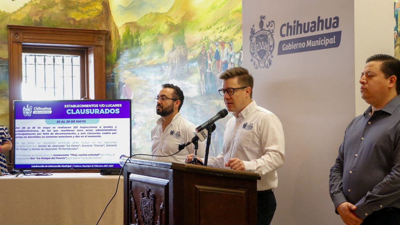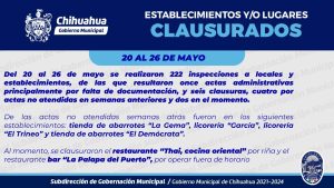 Gobierno Municipal de Chihuahua, a través de la Subdirección de Gobernación de la Secretaría del Ayuntamiento, informa que del 20 al 26 mayo se realizaron 222 inspecciones a locales y establecimientos, de las que resultaron 11 actas administrativas principalmente por falta de documentación, y seis clausuras en el momento.