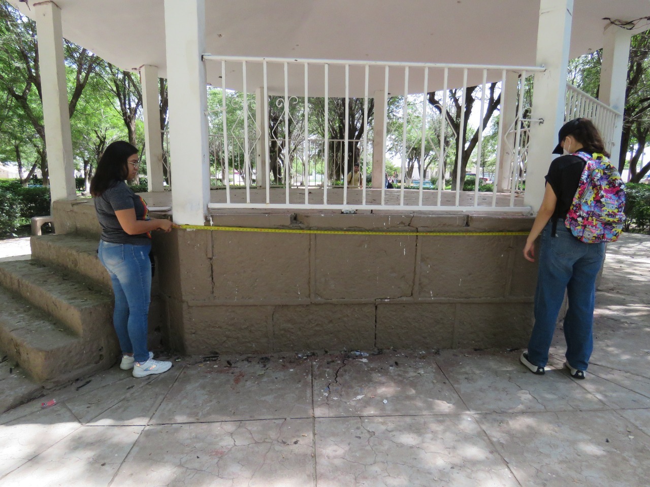 Como parte de los trabajos de colaboración, los estudiantes se dividieron en equipos de trabajo y de inmediato iniciaron con la medición del kiosco, la ubicación de las banquetas y su distribución, así como la cantidad de árboles y el tipo de vegetación que crece en esta plaza emblemática de El Sauz.