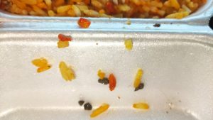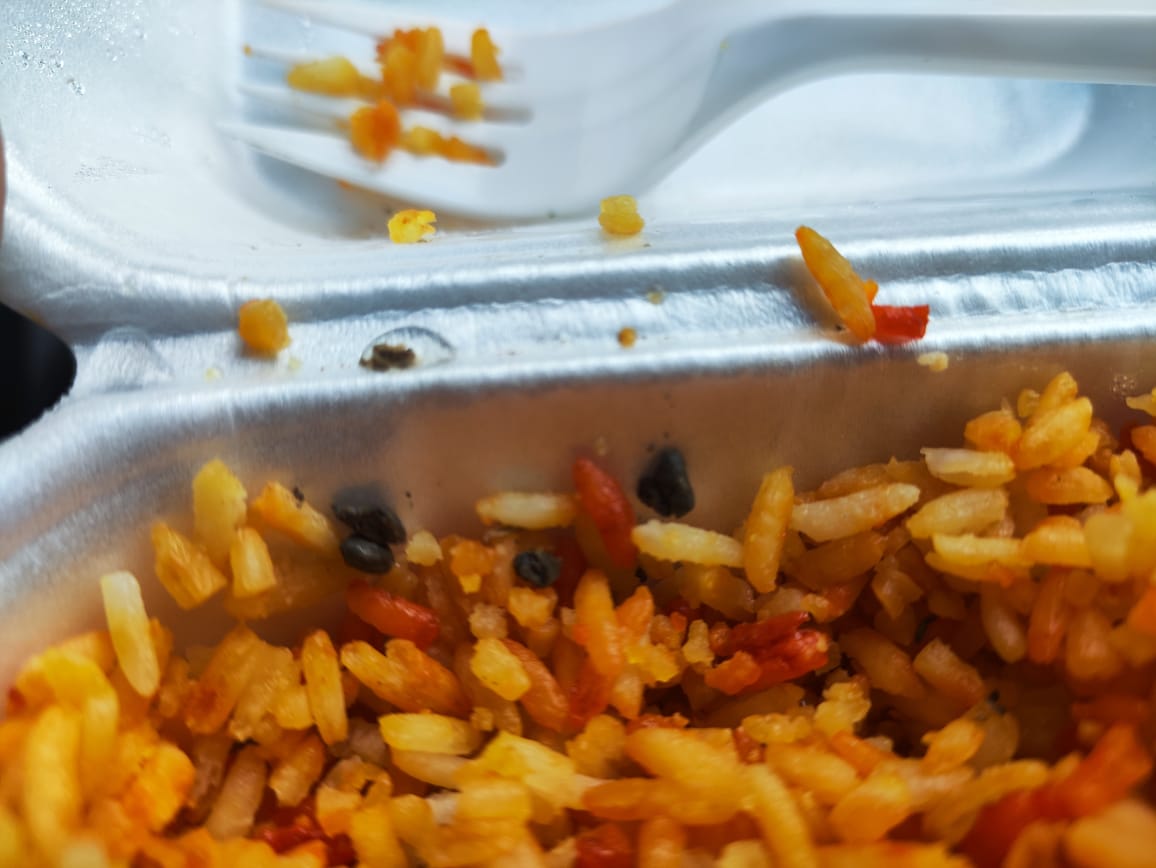 Entre el arroz de los platillos que ordenaron se percatan de unas bolitas negras que al revisar era excremento de ratón por lo que informaron al encargado del restaurante comentando éste que así era la comida.