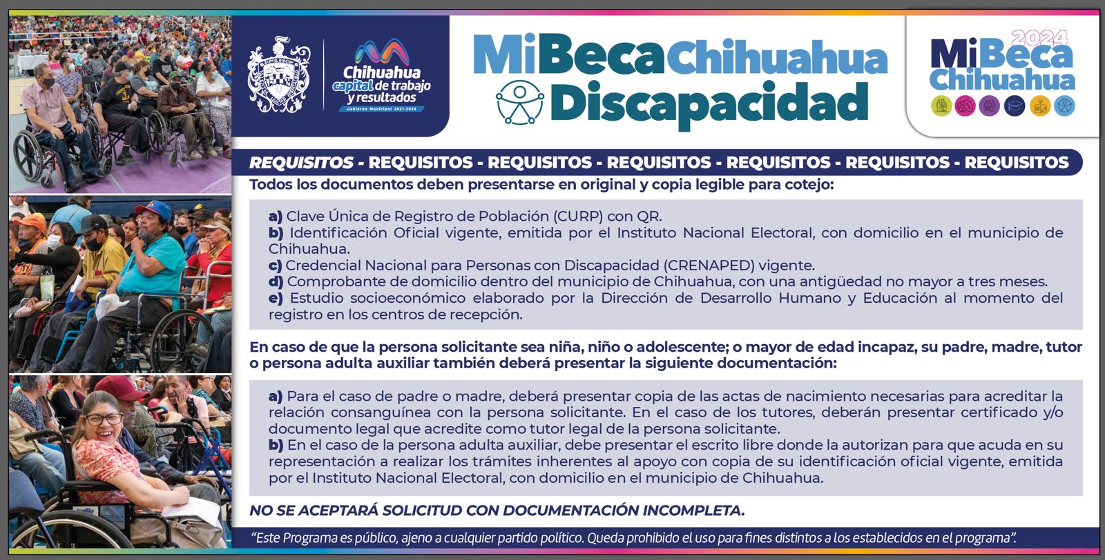 Con el objetivo de contribuir con el bienestar de las personas con discapacidad permanente, manifiesta y certificada que residen en el municipio de Chihuahua, el Gobierno Municipal, a través de la Dirección de Desarrollo Humano y Educación, invitan a las y los ciudadanos a conocer la convocatoria del programa “Mi Beca Chihuahua Discapacidad.