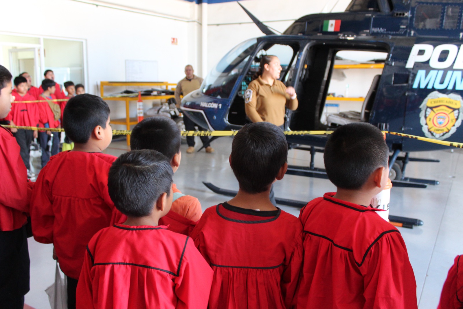 Debido al elevado número de estudiantes, las visitas guiadas fueron divididas en partes, haciendo más interactivo el aprendizaje para las y los infantes, quienes también recibieron una explicación por parte del personal de la Unidad de Operación Aéreas sobre la manera en que el helicóptero Halcón I vigila desde el aire.