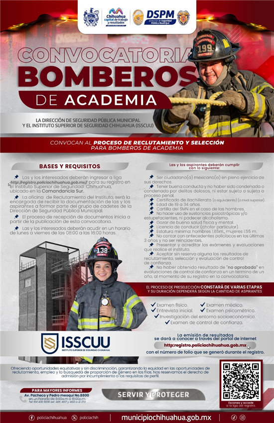 El jefe de Bomberos, Carlos Martínez, invitó a mujeres y hombres interesados en pertenecer a esta corporación, inscribiéndose en la página: http://www.registro.policiachihuahua.gob.mx/, donde podrán dejar sus datos y en breve serán contactados para una entrevista y continuar con el proceso.