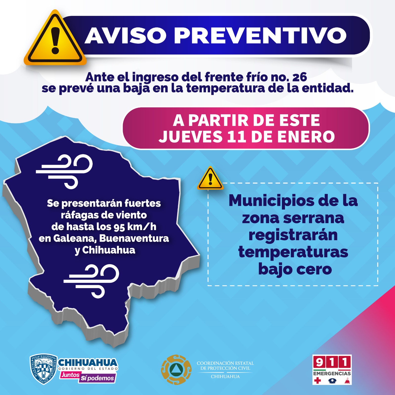 Por otra parte, durante la noche del jueves 11 y madrugada del viernes 12 de enero, se prevé la caída de lluvia, nieve y agua nieve en las partes altas de la sierra incluyendo a Janos, Casas Grandes, Nuevo Casas Grandes, Galeana, Madera, Ignacio Zaragoza, Gómez Farías y Temósachic, en tanto que para Juárez existe posibilidad de una ligera caída de aguanieve la noche de este jueves.