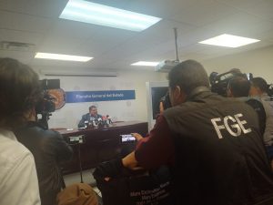 Fiscal en rueda de prensa: “En el lugar se localizaron 16 cartuchos quemados de un arma R15. Y el cuerpo presenta un solo balazo en la cabeza”.