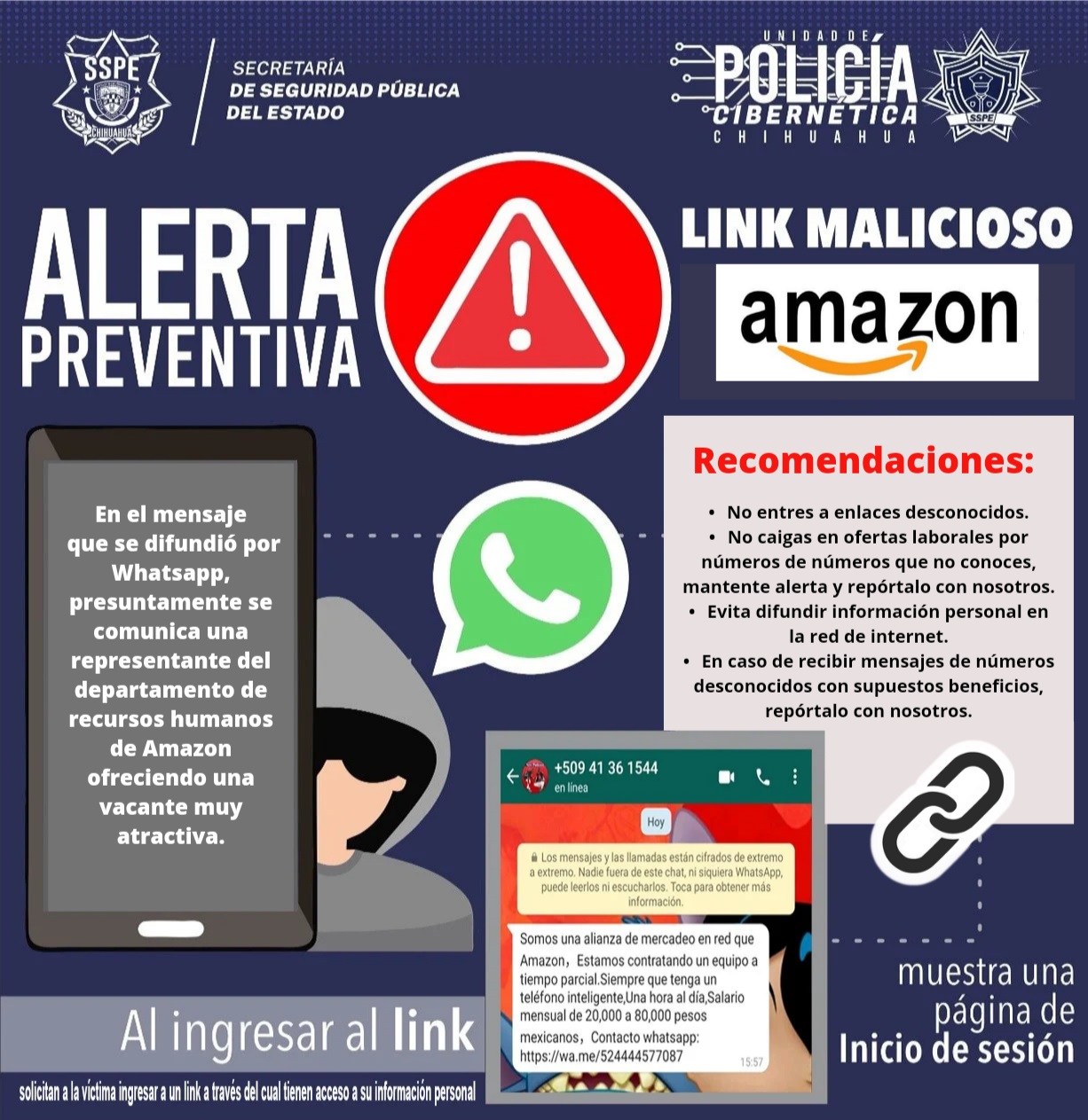 Se recomendó sospechar de anuncios que publiciten trabajos desde casa o en el extranjero, muy bien remunerados, en los que no se pide ningún tipo de experiencia previa y solicitar ayuda a la Unidad de la Policía Cibernética para autenticar los sitios web en el número de teléfono 614-429-3300 en la extensión 10955 y al correo ciberpolicia.sspe@chihuahua.gob.mx.