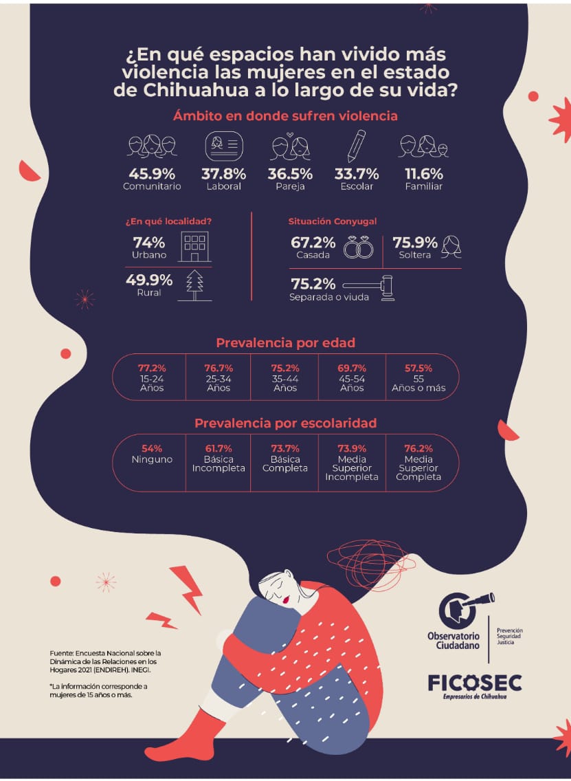 De acuerdo con el resultado de la Encuesta Nacional sobre las Dinámica de las Relaciones en los Hogares (Endireh, Inegi, 2021) es en el ámbito comunitario (espacios públicos, calle, barrio o colonia, entre otros) en donde las mujeres de 15 años o más han sufrido más violencia en Chihuahua: cerca del 50% de este grupo la ha padecido en algún momento de su vida.