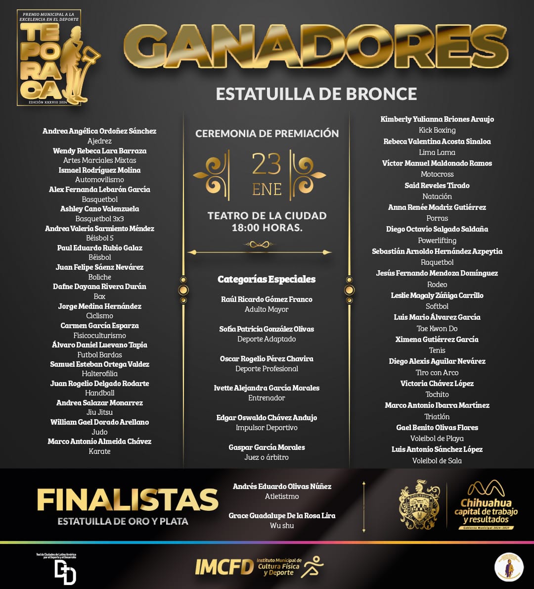 Las estatuillas del Premio Municipal a la Excelencia del Deporte ‘Teporaca’ que otorga el Ayuntamiento de Chihuahua en coordinación con la Asociación de Cronistas Deportivos ‘Pancho Cano’, iniciadores de este reconocimiento para la comunidad deportiva, serán entregadas en una ceremonia solemne de Cabildo el jueves 23 de enero 2025.