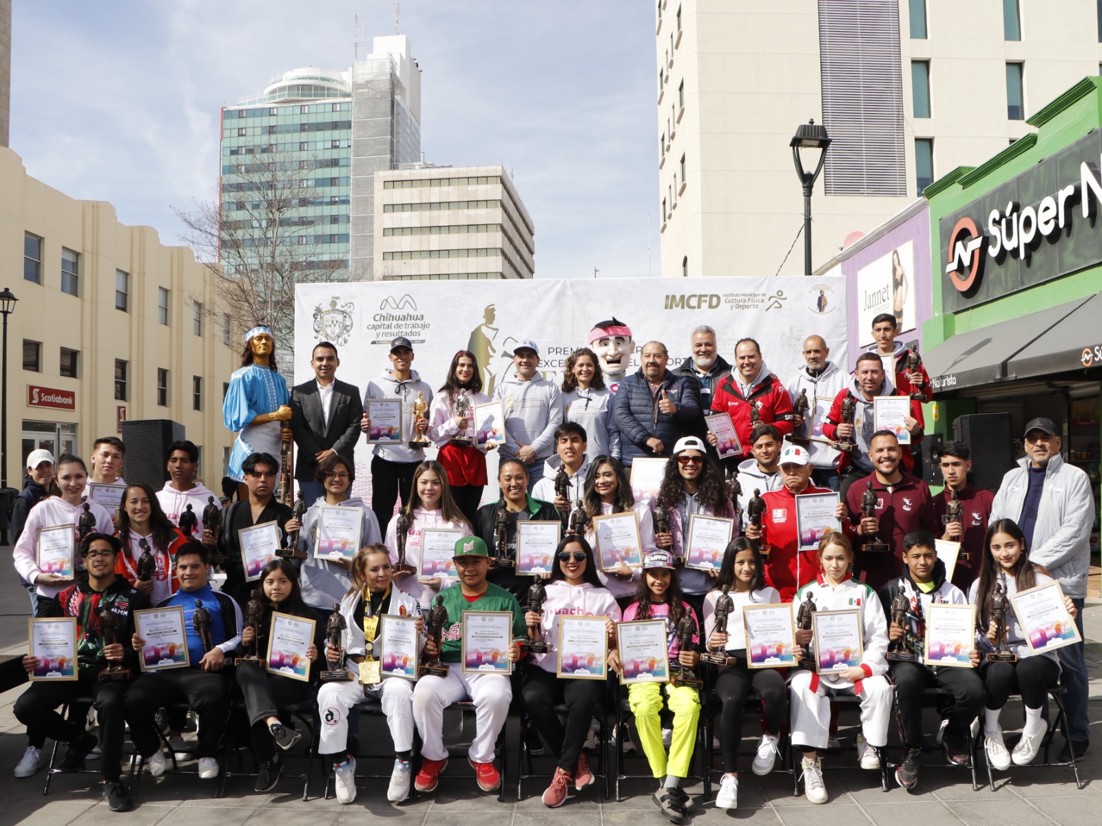Al finalizar el recorrido del desfile, las y los galardonados recibieron un reconocimiento como parte de su premiación, aunado a la estatuilla bañada en oro, plata y bronce, así como una beca económica a través del programa municipal Mi Beca Chihuahua de Fomento Deportivo.