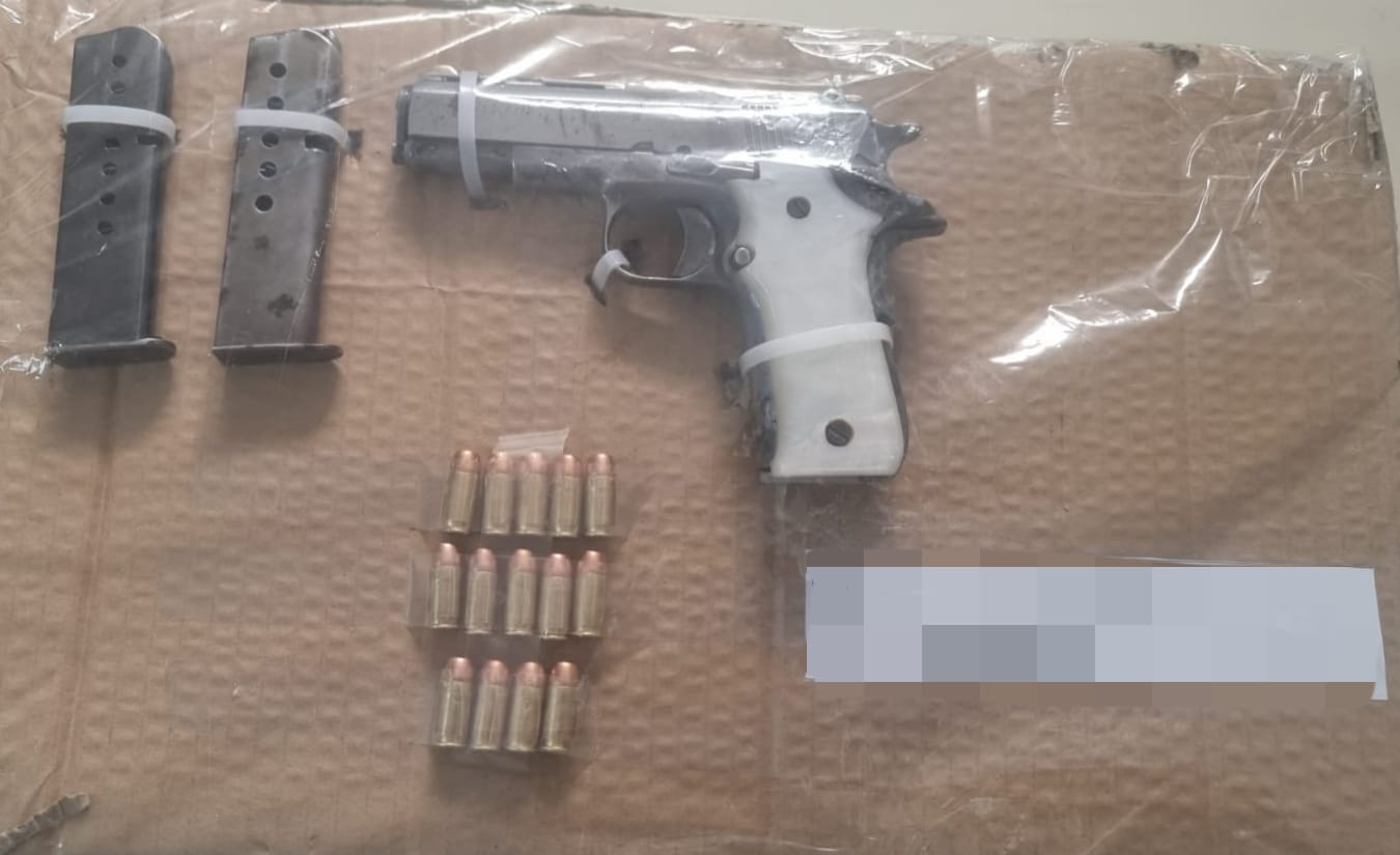 Al realizar una inspección del vehículo, los elementos de la SSPE localizaron una pistola de color gris con cachas blancas calibre .380 y dos cargadores abastecidos con 14 cartuchos útiles calibre .380 ACP.
