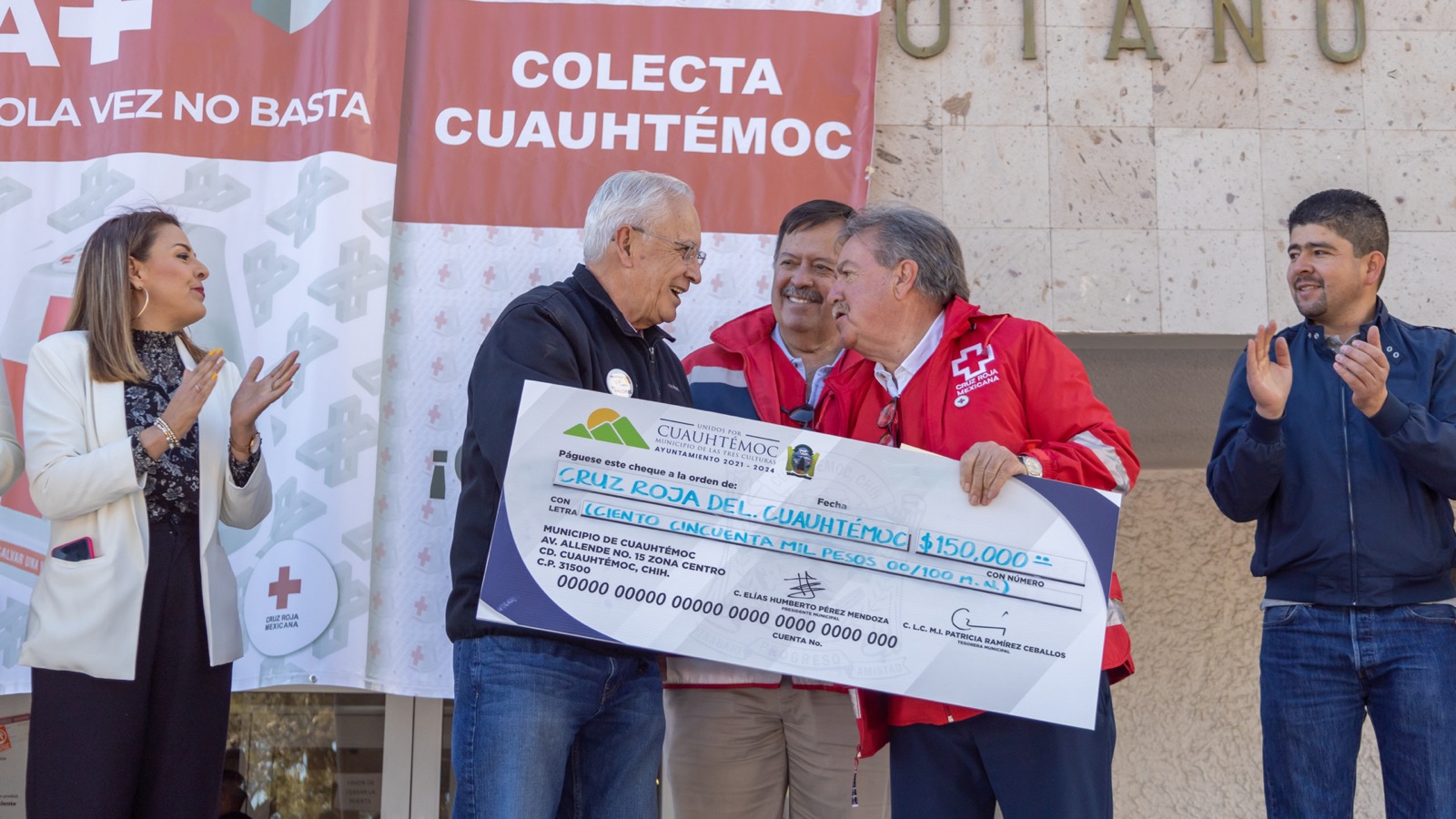Cd. Cuauhtémoc, Chih.- A nombre del Municipio de Cuauhtémoc, el alcalde Beto Pérez entregó un cheque por 150 mil pesos a Cruz Roja Delegación Cuauhtémoc. A su vez, en representación del Presidente Municipal, el director de Desarrollo Social, Miguel Holguín, entregó otro cheque por 150 mil pesos a la Delegación Manitoba, en Álvaro Obregón.