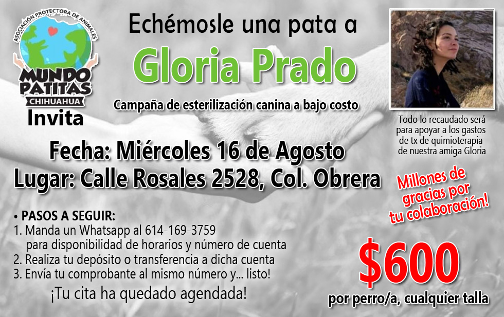 «Echémosle una pata a Gloria», es un evento en el cual la asociación destinará todo lo recaudado con el servicio de esterilización de mascotas a los gastos del tratamiento de Gloria.