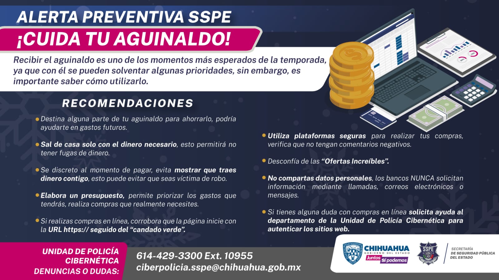 La Unidad de Policía Cibernética de la Secretaría de Seguridad Pública del Estado (SSPE), lanzó una alerta preventiva a quienes planean utilizar el pago de su aguinaldo en compras en línea, para evitar que sean víctimas de robo o estafa.