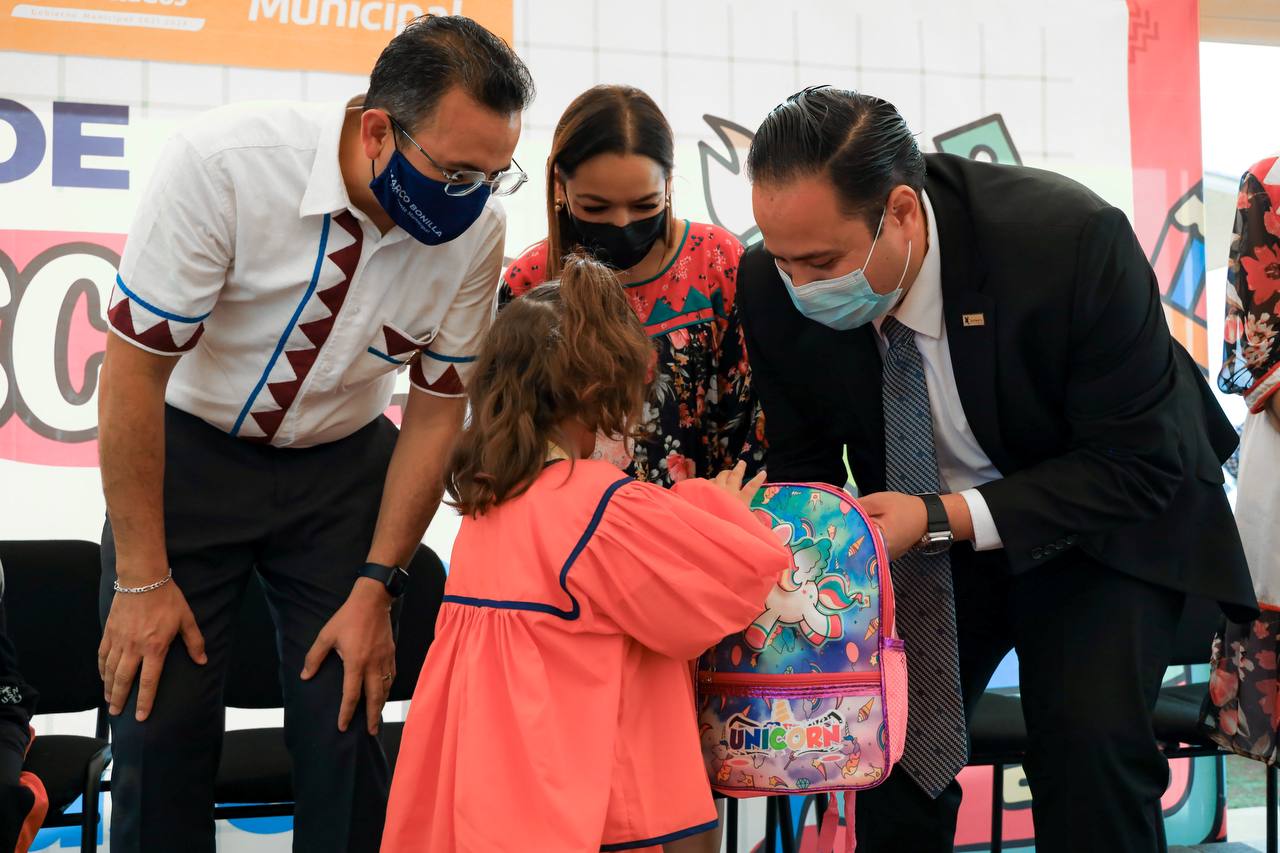 En la semana del regreso a clases, el alcalde Marco Bonilla y la presidenta del DIF Municipal, Karina Olivas, entregaron 117 kits de útiles escolares a niñas y niños del kínder “Josefa Ortiz de Domínguez” en la colonia Agrícola Francisco Villa, al norte de la ciudad.