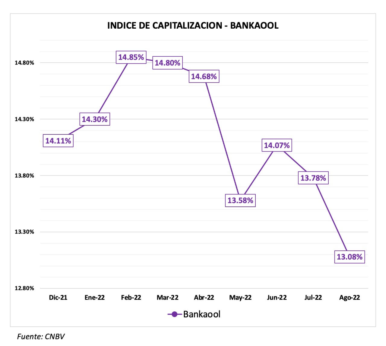 En el reporte, la CNBV establece que el Icap de la banca múltiple se ubicó en 18.75 por ciento, con un Coeficiente de Capital Básico (CCB) de 17.41 por ciento y un Coeficiente de Capital Fundamental (CCF) de 15.91 por ciento, indicadores todos en los que Bankaool mantiene un 13.08 por ciento.