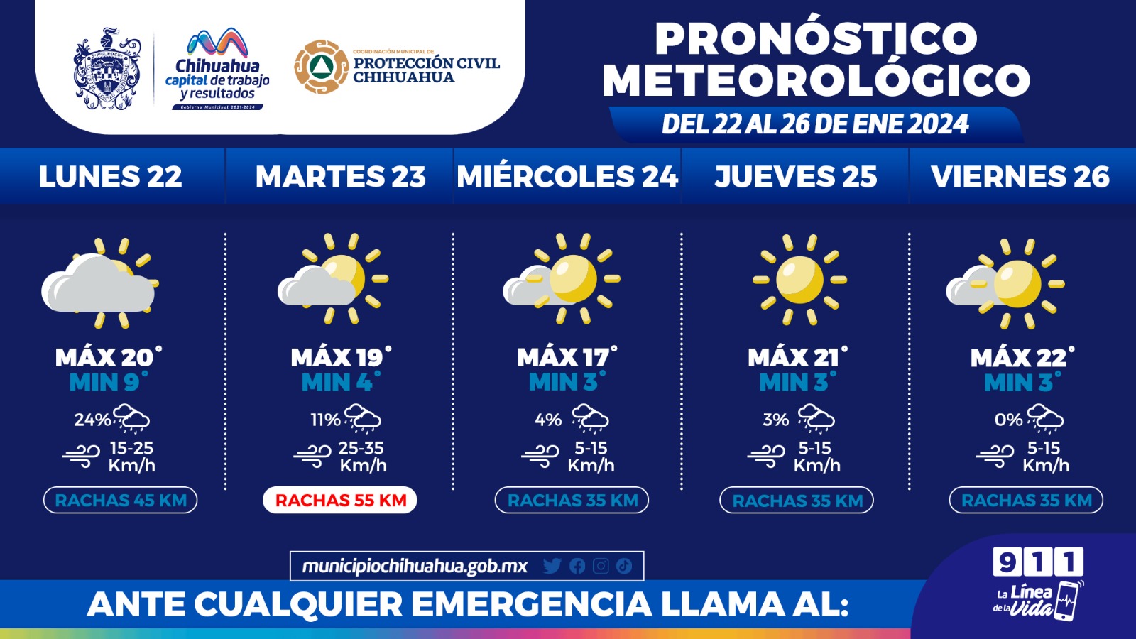 La Coordinación Municipal de Protección Civil informa que, para esta semana, del 22 al 26 de enero, se prevén temperaturas mínimas de 3°C y 4°C, así como se esperan vientos fuertes para el día martes, por lo cual se exhorta a la población a atender las recomendaciones de las autoridades a fin d evitar complicaciones en la salud.