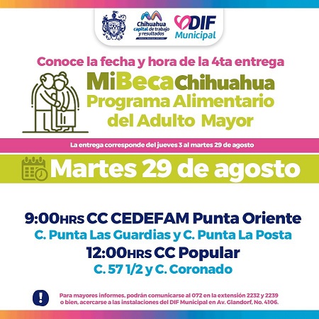 Los adultos mayores beneficiarios del Programa Alimentario del Adulto Mayor (PAAM) podrán acudir este 29 de agosto por su apoyo alimentario al CEDEFAM Punta Oriente y al centro comunitario Popular.