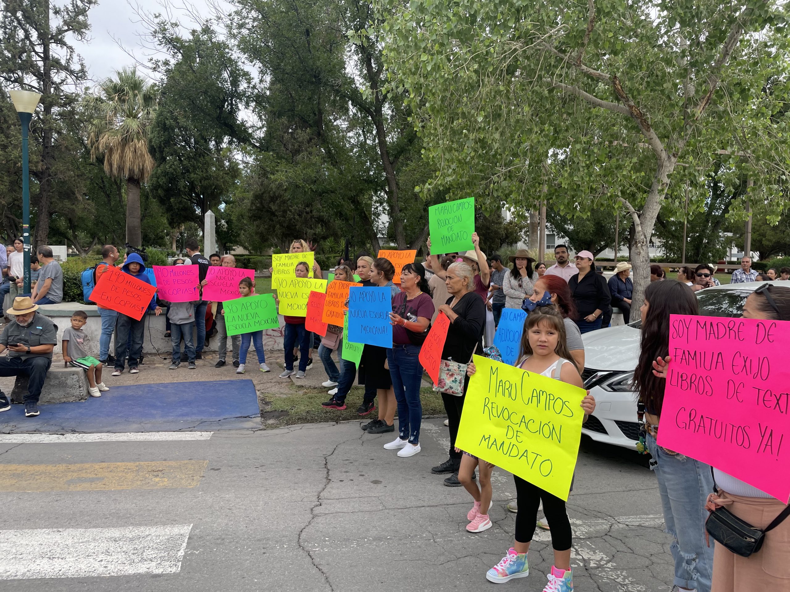 Con pancartas como soy “madre de familia y exijo los libros de texto gratuito” “Maru Campos revocación de mandato “190 millones de pesos en copias”, pidieron al estado rectificar.