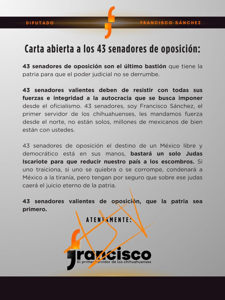 El diputado y dirigente estatal de Movimiento Ciudadano, Francisco Sánchez Villegas, envió una carta a los 43 senadores que integran la oposición para urgir a actuar con valentía y entereza y rechazar la reforma judicial que el régimen pretende imponer en el país.