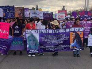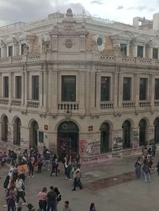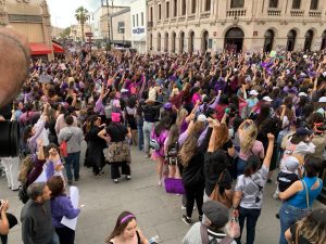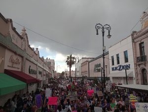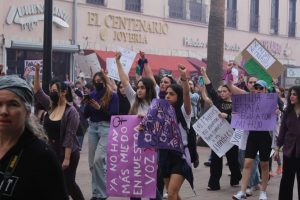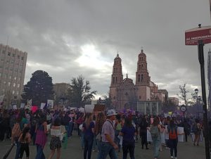 Los gritos y repudio, fue evidente, pero no solo en ese lugar. De ahí se fueron por toda el sector comercial de la calle Libertad, hasta llegar a la plaza frente a Catedral. También en presidencia municipal se dejó plasmada la inconformidad con leyendas y mujeres que levantaban el puño en señal de justicia.