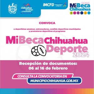Chihuahua, Chih. A 31 de enero de 2024.- El próximo martes 6 comenzará el periodo para la recepción de documentos del programa “Mi Beca Chihuahua de Fomento al Deporte”, que impulsa el Gobierno Municipal de Chihuahua, a través del Instituto Municipal de Cultura Física y Deporte, para apoyar con estímulos económicos a deportistas y comunidad del deporte.