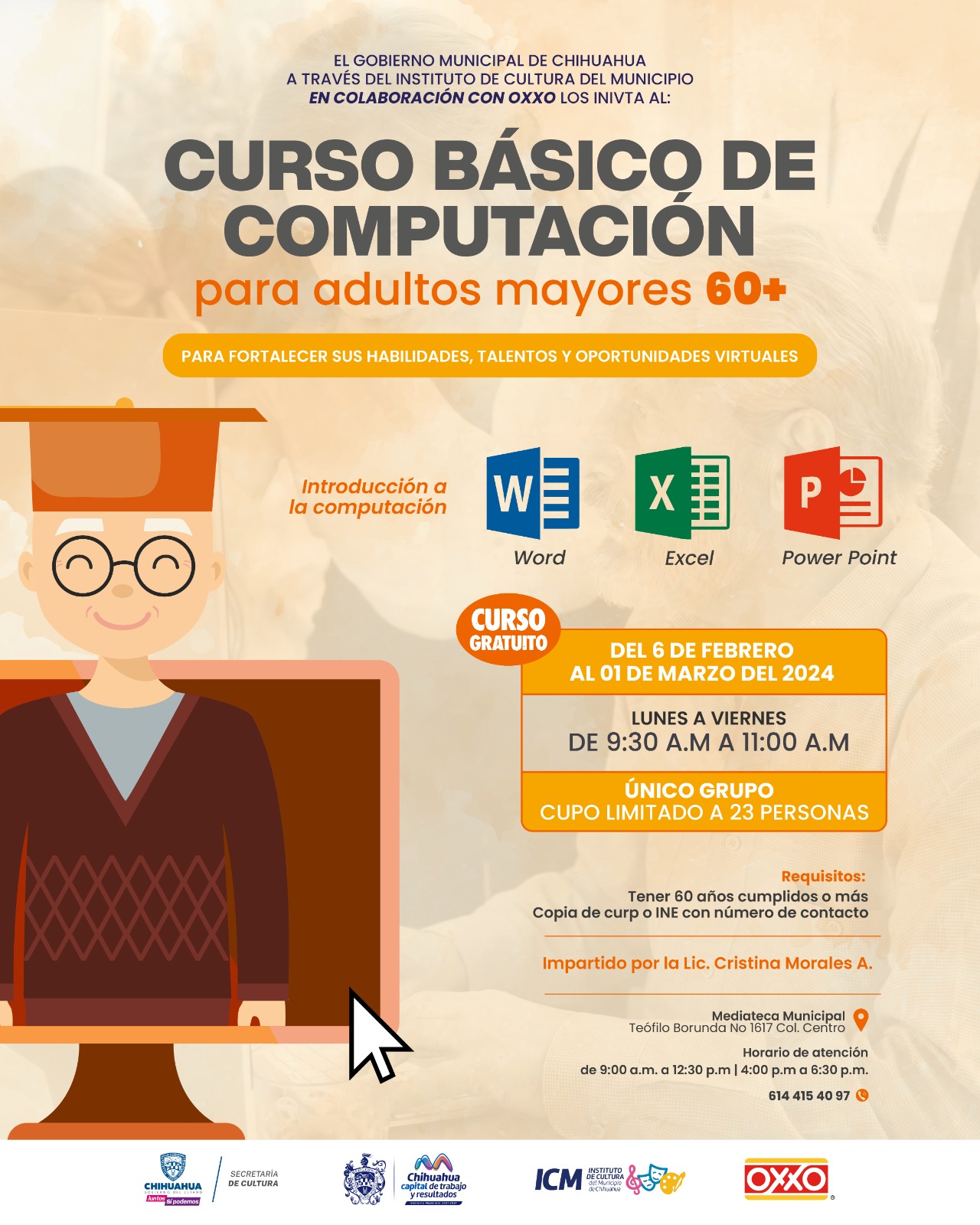 Es requisito indispensable tener 60 años cumplidos o más. Para más información o registro, llama al número 614-415-40-97 o bien, acudir a las instalaciones de la Mediateca Municipal en la calle Teófilo Borunda número 1617, colonia Centro, en un horario de atención de 9:00 am a 12:30 pm y de 4:00 a 6:30 pm.
