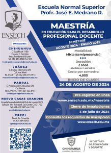 La Escuela Normal Superior del Estado de Chihuahua “Prof. José E. Medrano” (Ensech), invita a la ciudadanía a cursar la Maestría en Educación para el Desarrollo Profesional Docente, correspondiente al semestre agosto 2024- enero 2025.