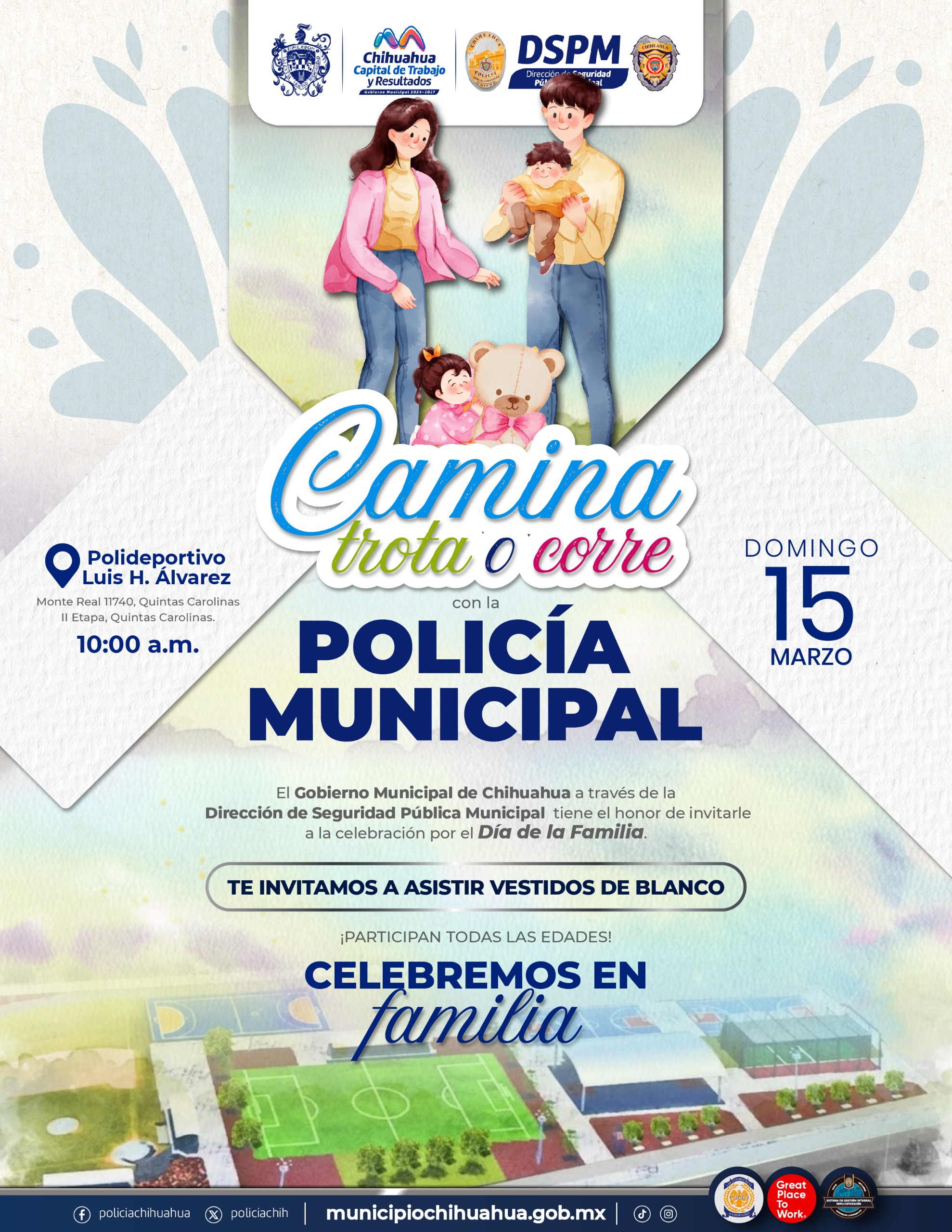 La Dirección de Seguridad Pública Municipal invita cordialmente a la comunidad deportiva y a todas las familias de Chihuahua a participar en la edición 2026 de “Camina, Trota o Corre con la Policía Municipal”, un evento pensado para promover la convivencia familiar, la activación física y el fortalecimiento de los lazos entre ciudadanía y corporaciones de seguridad.