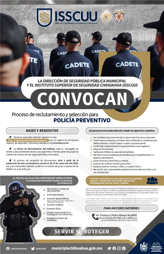 El Gobierno Municipal de Chihuahua, a través de la Dirección de Seguridad Pública Municipal (DSPM), invita a mujeres y hombres con vocación de servicio hacia su comunidad, a registrarse en el proceso de reclutamiento y selección para formar parte de la Policía Municipal que continúa abierto.