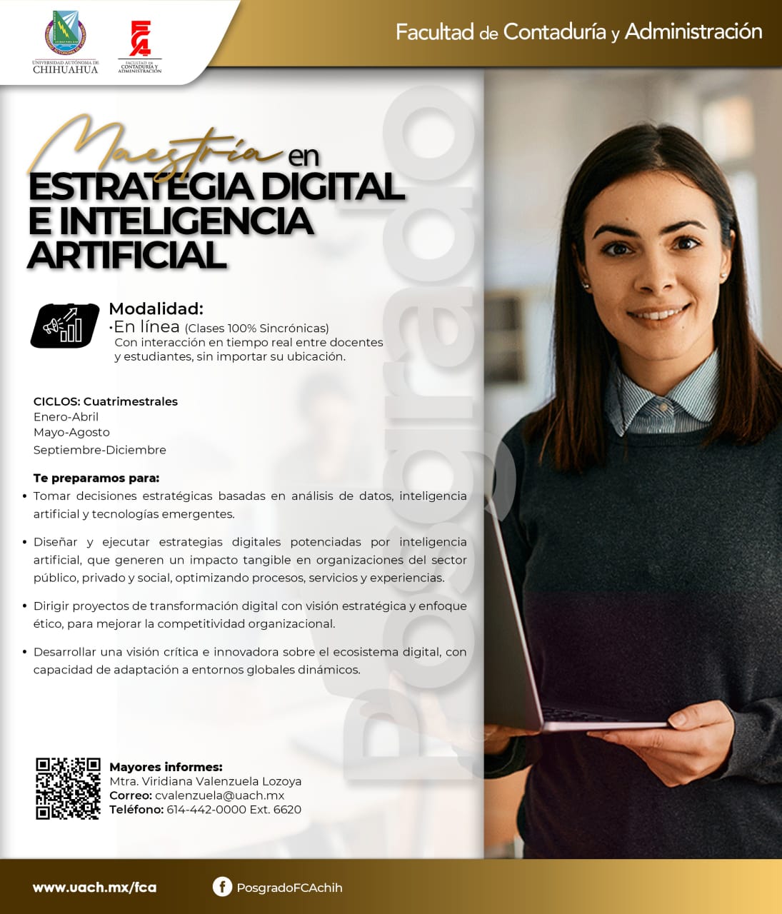 La Universidad Autónoma de Chihuahua, a través de la Facultad de Contaduría y Administración anuncio el lanzamiento de su nuevo programa de posgrado: la «Maestría en Estrategia Digital e Inteligencia Artificial», un programa de posgrado innovador diseñado para formar líderes capaces de dirigir procesos de transformación digital, implementar estrategias basadas en inteligencia artificial y generar impacto en las organizaciones públicas y privadas.