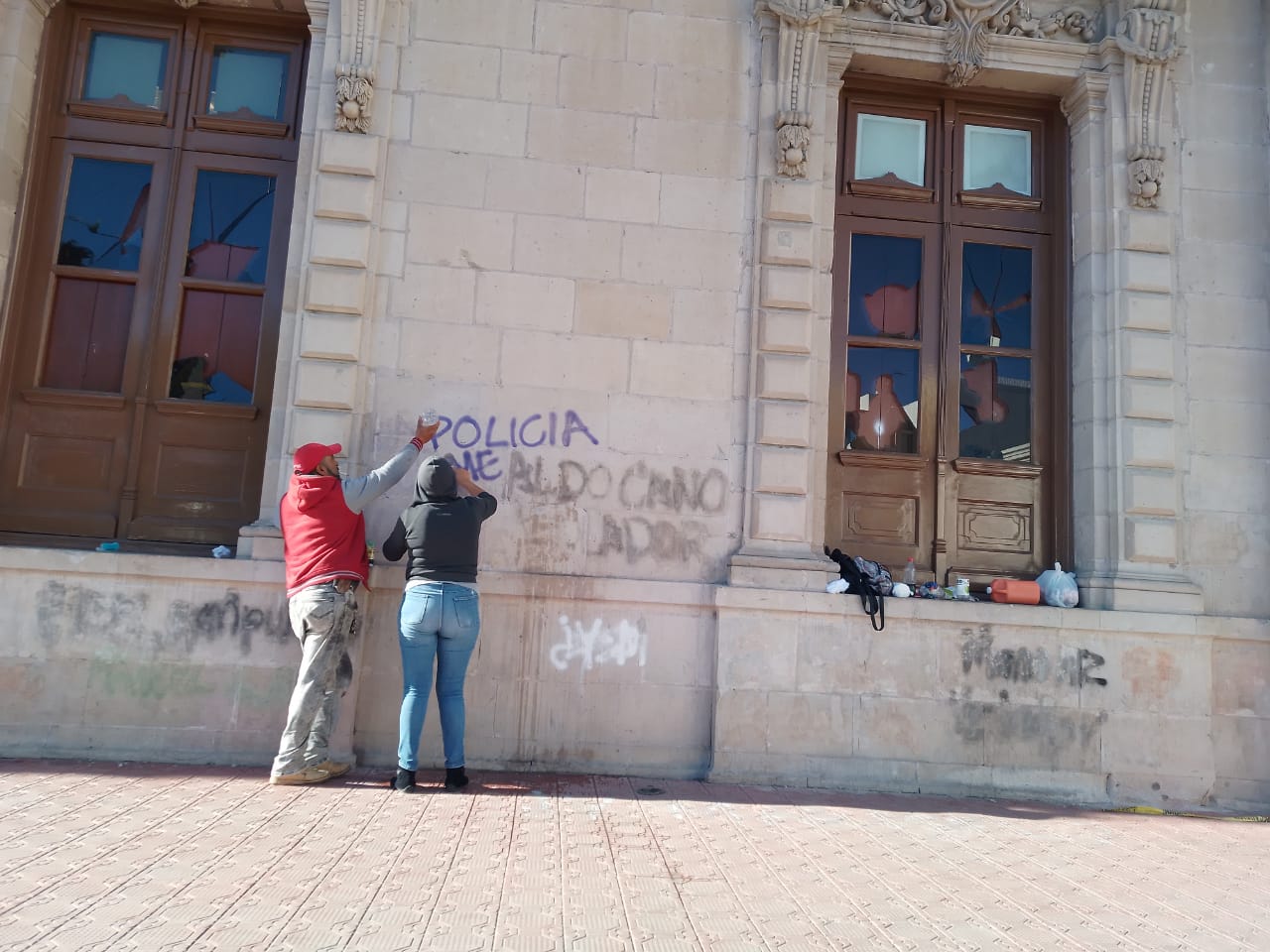 Desde ayer personal de limpieza trabaja en remover las pintas realizadas por mujeres durante la marcha por el 25 de Noviembre, Día Internacional de la Eliminación de la Violencia Contra las Mujeres.