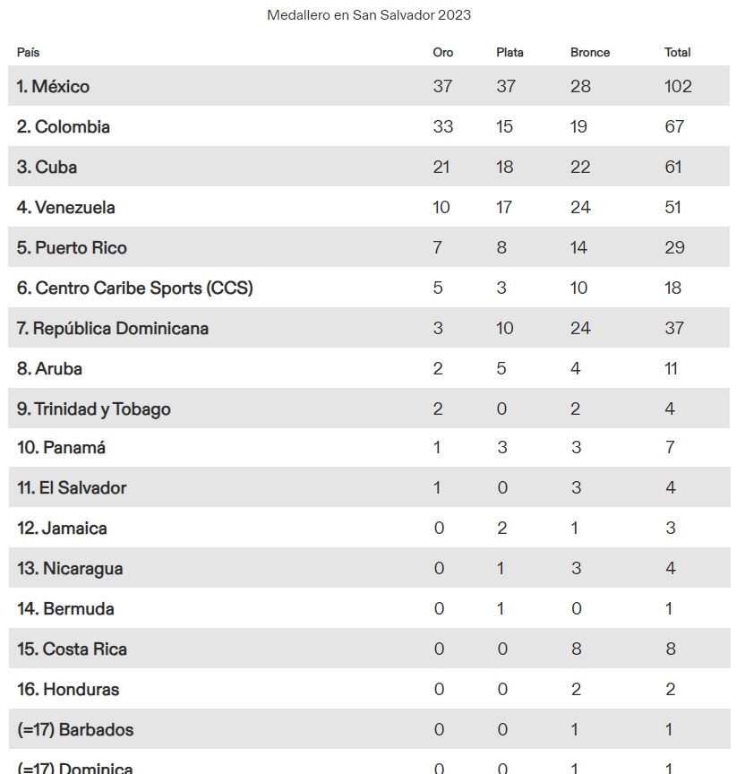 Descubre aquí, en la tabla de medallas a continuación que será actualizada diariamente después de cada día de competición, qué nación es la que lidera el medallero en San Salvador 2023.
