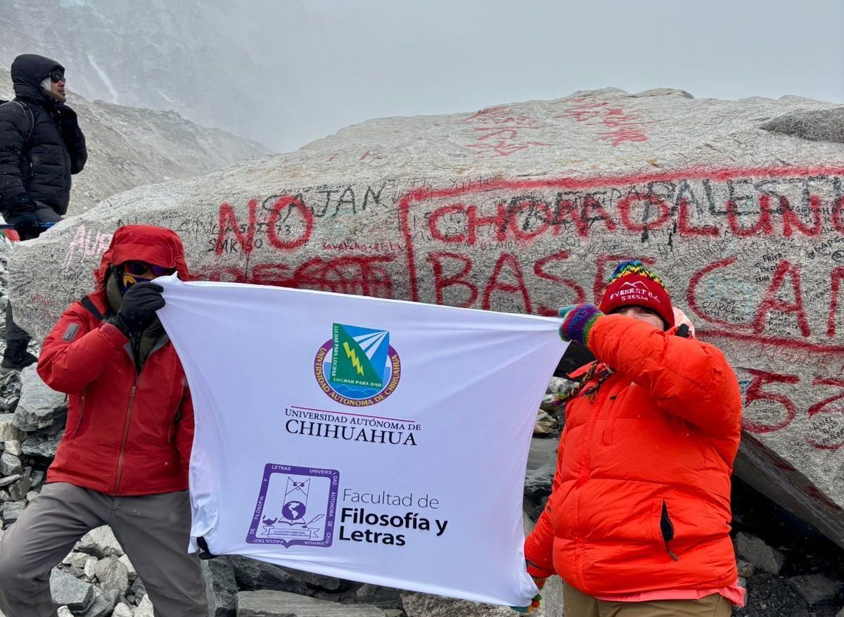 La pasión por la filosofía puede escalar montañas, literalmente. Así lo demostró Mercedes Reza Torres, estudiante de la Facultad de Filosofía y Letras de la Universidad Autónoma de Chihuahua (UACH), quien este 28 de diciembre logró una hazaña digna de admiración: llegar al Campamento Base del Everest, a 5,364 metros sobre el nivel del mar, enfrentando temperaturas de -30 grados.