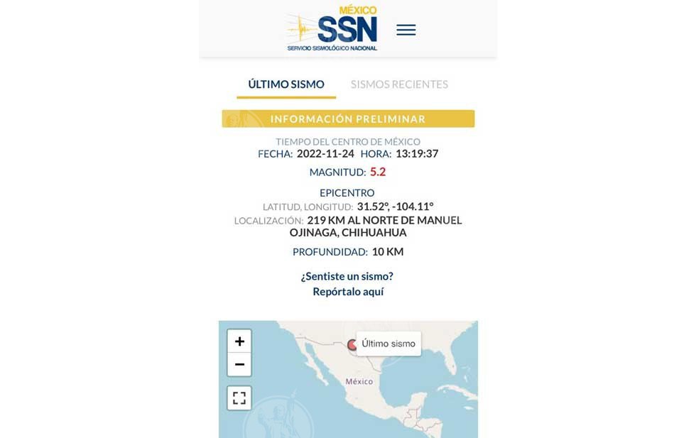 Un movimiento telúrico se 5.2 grados con epicentro a 219 kilómetros al norte del municipio de Ojinaga, Chihuahua, en Texas, se sintió esta tarde en la zona de Juárez.
