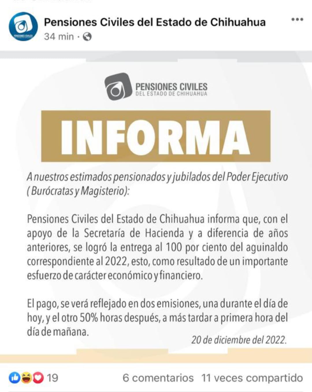 Efectivamente, en años anteriores los jubilados estatales habían sufrido retrasos de hasta un mes en el pago de esta compensación anual, debido al desorden financiero de los gobiernos de Javier Corral y César Duarte.
