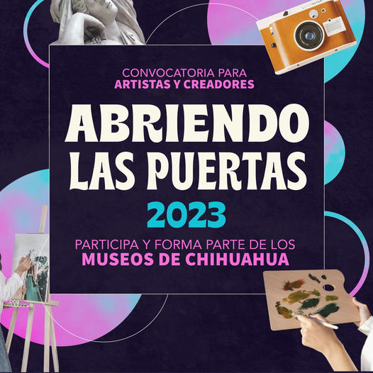 El Gobierno Municipal de Chihuahua, a través del Instituto Municipal de Cultura (ICM), invita a los artistas visuales, escultores y creadores chihuahuenses a participar en la convocatoria “Abriendo las Puertas”, la cual se desarrolla para que los participantes puedan concursar para que su obra sea elegida para ser expuesta en los museos de la ciudad de Chihuahua.