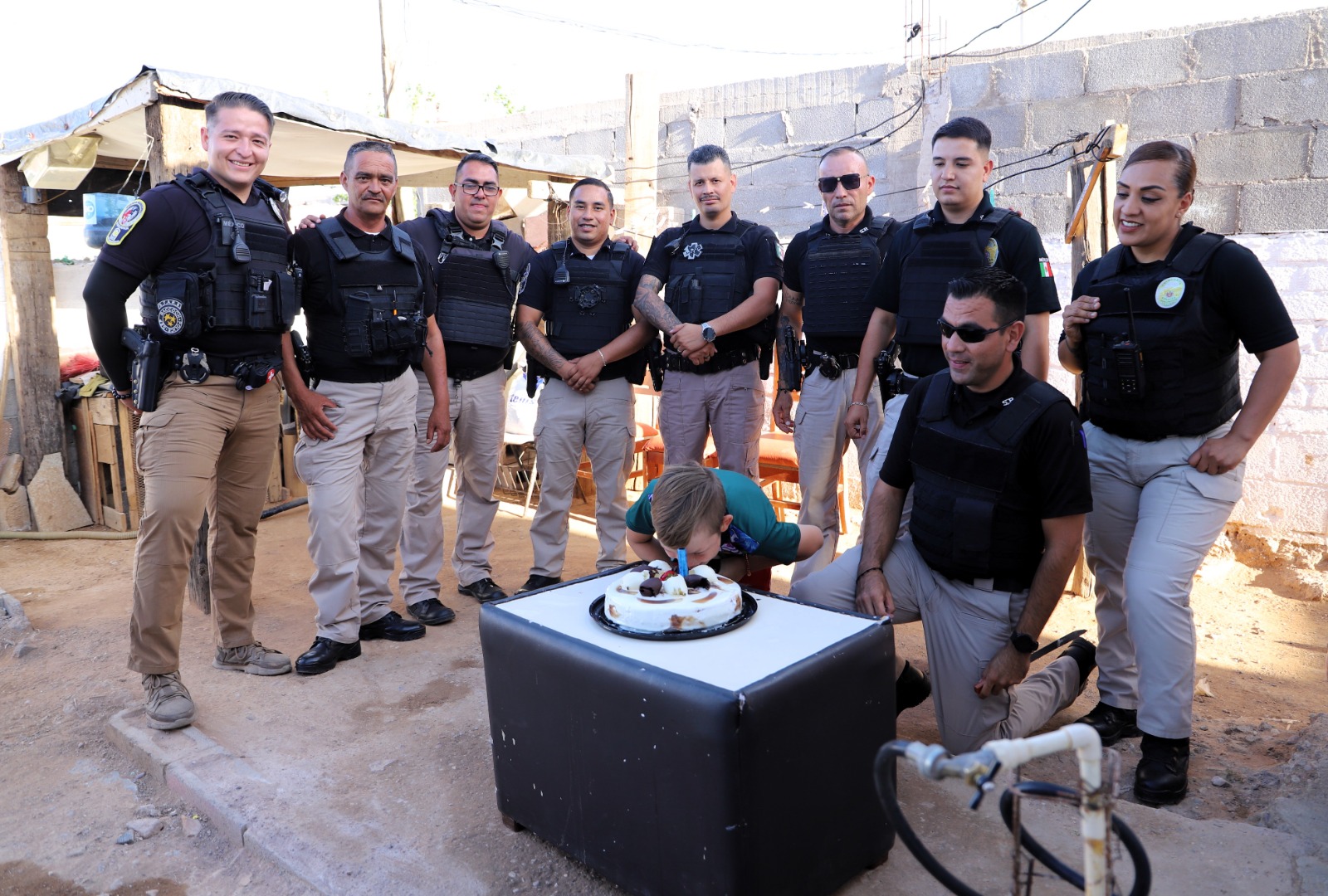 Policías municipales festejaron al niño Jahir Alonso quien en su cumpleaños número ocho, tenía el sueño de que policías estuvieran presentes en su fiesta para escuchar las sirenas de las patrullas cuando llegaran a su casa.