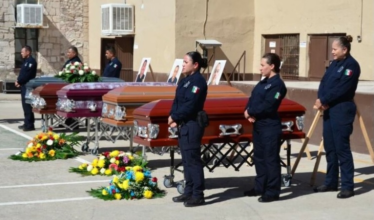 Al frente de uno de los patios comenzaron a colocar los ataúdes. Solo se escuchaba el ruido de las ruedas de las bases donde los féretros y la orden de un hombre que indicaba como hacerlo. Varios elementos atentos a la orden para ayudar a cargar los restos de sus compañeros.
