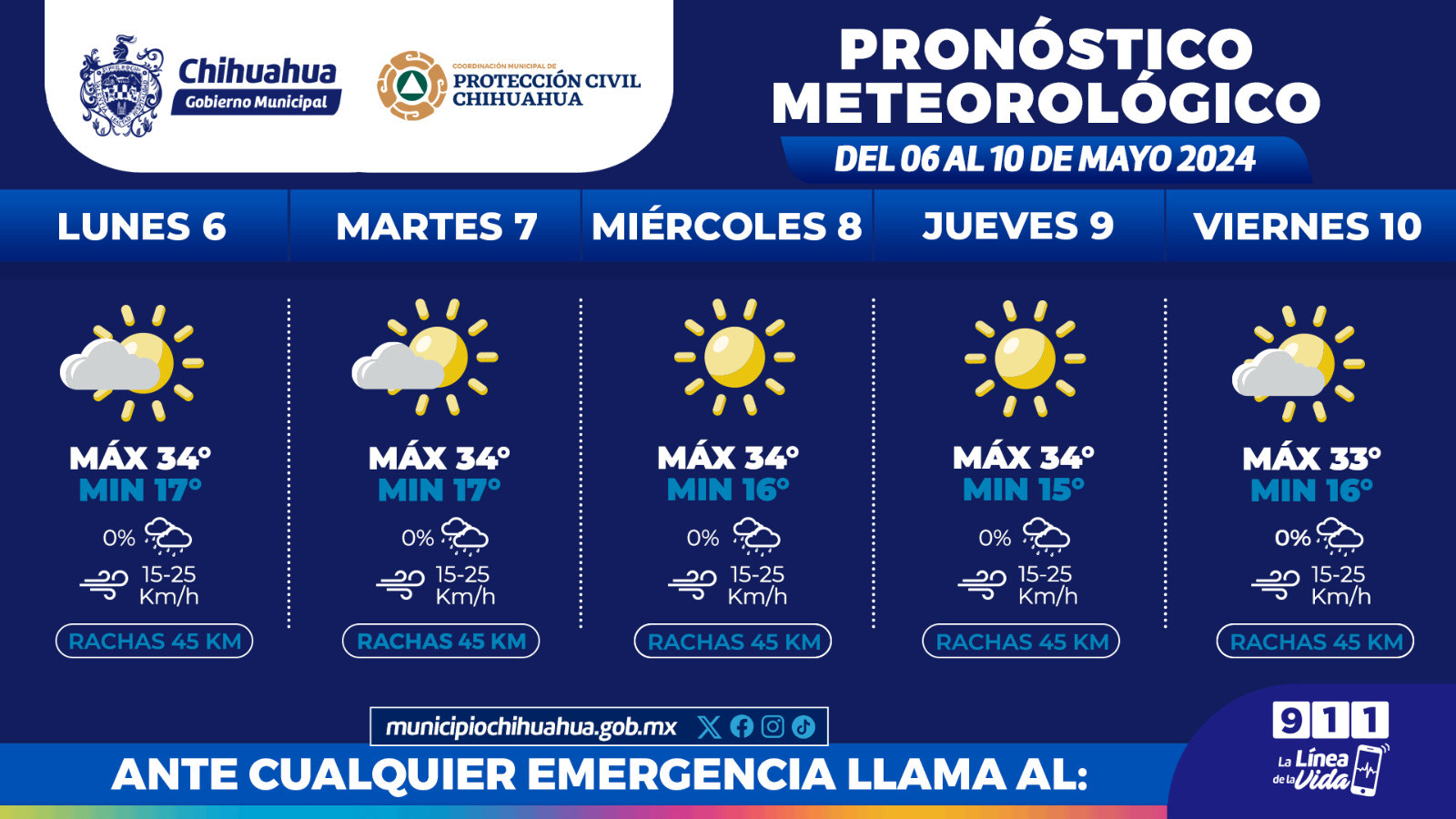 La Coordinación de Protección Civil Municipal informa que para esta semana se prevén vientos con rachas de hasta 45 kilómetros por hora, además de que seguirán las temperaturas máximas en 34°C.