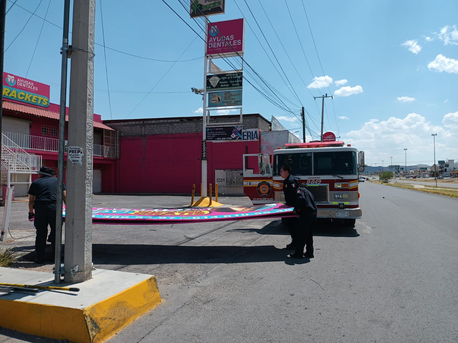 Un hombre quedó herido tras caerle un espectacular encima cuando caminaba sobre la calle Guillermo Prieto Luján y Medanos de Samalayuca y en la Plaza Comercial ‘Memus’, se desprendió la estructura de metal y golpeó a la persona.