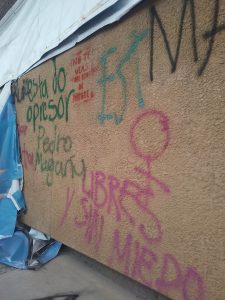 Además pintaron consignas como «justicia», «estado feminicida», «medios mentirosos», y decenas de nombres a quienes acusan de violación.