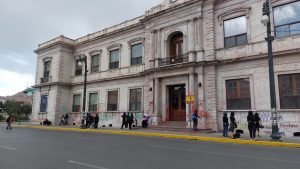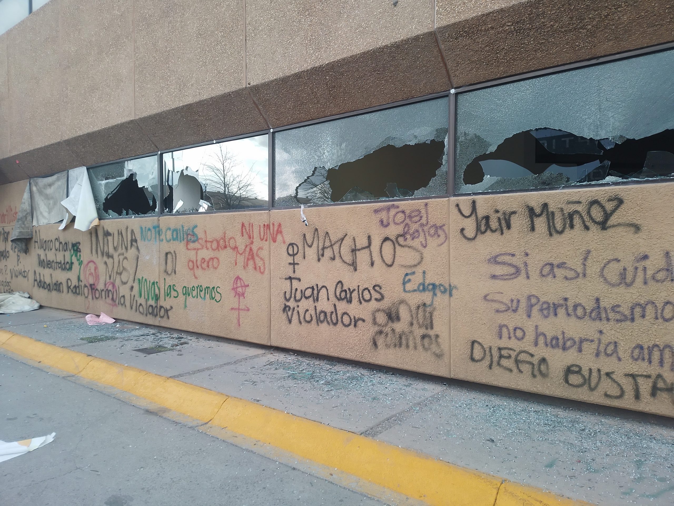 Las manifestantes feministas que salieron hoy a marchar en exigencia de justicia, quebraron los vidrios de Palacio de Gobierno, Congreso del Estado, Rectoría de la UACh y El Diario de Chihuahua.